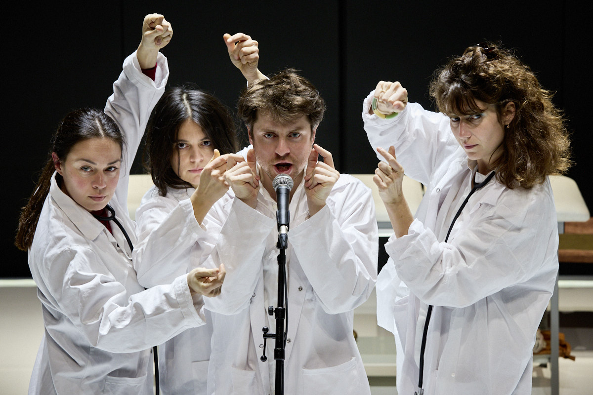 Paris, 2027. Depuis que les femmes parlent et qu’on les écoute, de nouvelles pathologies apparaissent, ce qui alerte l’O.M.S et la communauté scientifique. Pour y faire face, l’hôpital de la Pitié-Salpêtrière vient d’ouvrir une unité de soins et de recherche dirigée par Rose Spillerman, neuropsychiatre iconoclaste, flanquée de son indéfectible assistant Mario, chef de la chorale de l’hôpital. Iris, accompagnée de sa sœur Marguerite, est placée en observation car elle a brutalement cessé de parler. Tous les moyens seront bons pour élucider son cas – la chambre d’hôpital d’Iris devenant alors le lieu de toutes les fictions, toutes les fantasmagories. Nathalie Fillion a écrit et mis en scène un spectacle choral comme une fantaisie joyeuse, un roman d’anticipation. Parlé, chanté, joué, dansé, combatif et jubilatoire, Sur le cœur tente de saisir le chaos du monde pour écrire de nouveaux possibles et rire, ensemble, du désastre.