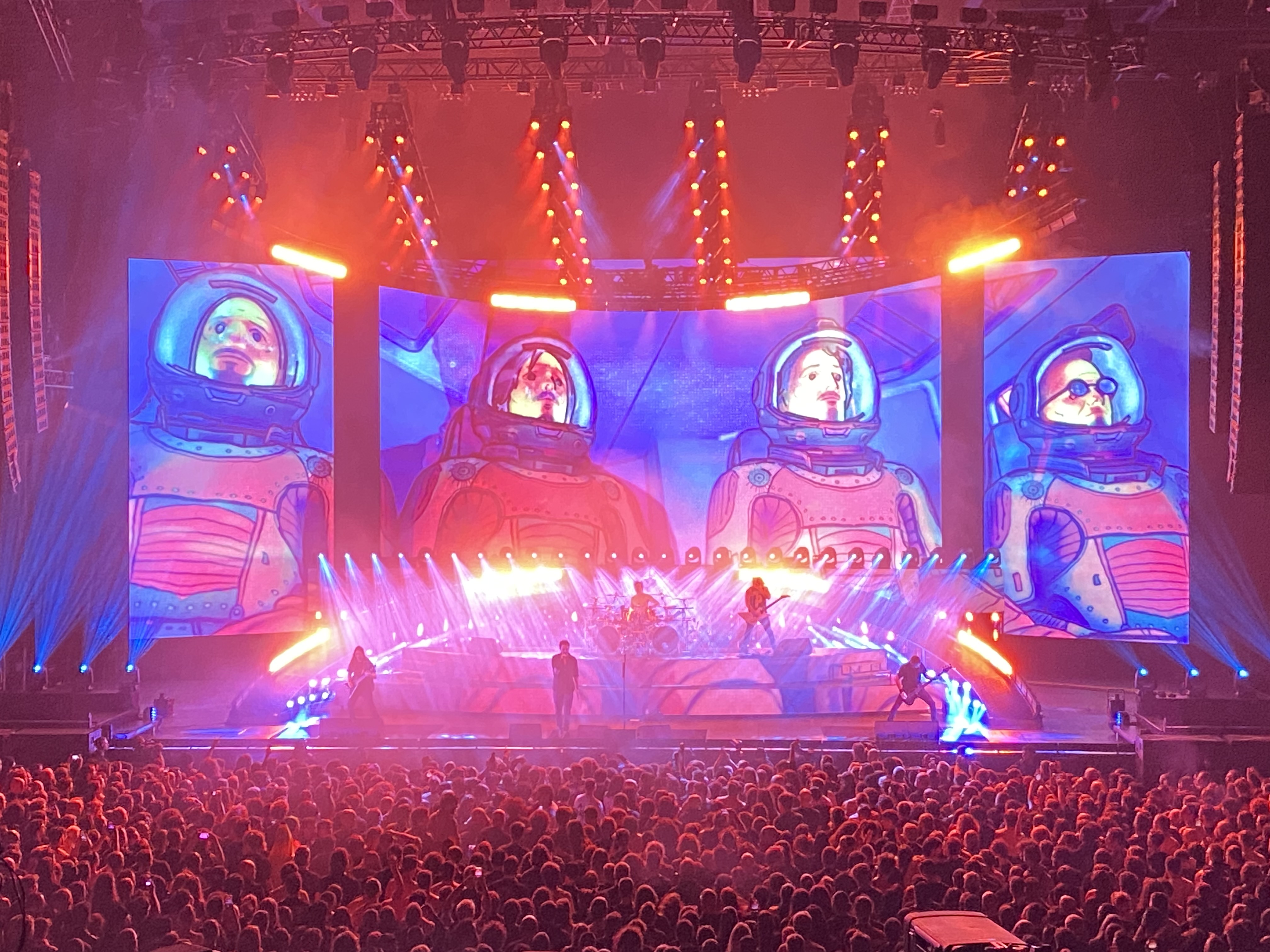 C’est dans un Palais NIKAIA quasi comble et devant un public étonnamment mixte et transgénérationnel que le phénomène Gojira a donné, le 8 décembre, ce qui semble être son premier concert à Nice. Boosté par son passage mémorable à la cérémonie d’ouverture des Jeux Olympiques de Paris 2024 avec « Mea Culpa (Ah ! Ça ira !) » (N°1 aux USA), le groupe landais s’offre une tournée des zéniths français avec une production enfin digne de leur statut sur la scène metal internationale: light show XXL, écrans géants, projections (dont un dessin animé SF sur « Another World« ), pyrotechnies omniprésentes et les mêmes baleines-drones que Julien Doré (« Flyin Whales ») . Un show essentiellement basé sur les derniers albums , qui a ravi les fans avec des riffs puissants, mêlés à des rythmes complexes et des textes profondément engagés sur l’environnement et l’humanité. Privé de guitare par une blessure à la main le beau Joe Duplantier a pu se consacrer au chant et à son jeu de scène, avec le soutien de son vieil ami Greg Kubaci à la six cordes. Une configuration inédite qui donnait une saveur supplémentaire à l’évènement. On espère ne pas avoir à attendre des lustres pour revoir Gojira en live sur la Côte d’Azur.